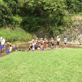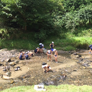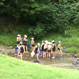 川の生き物が好きな子どももたくさんいて,次から次にいろいろな生き物を見つけていきました。見つけた生き物はトレーに入れて観察し,その後川にもどしてあげます。
