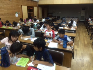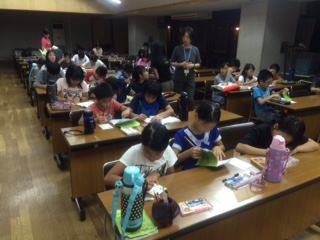 3日目の夜の活動で「絵はがき」をかいているところです。3日目までの活動を振返り楽しかったこと・心に残ったことをかいています。