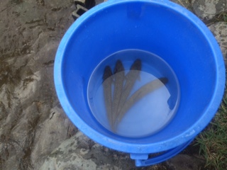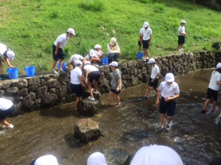 早く捕れた人は,まだ捕れていない友達を手助けしています。ようやく班全員の魚が捕れました。