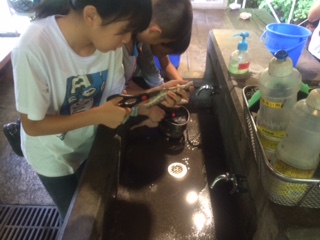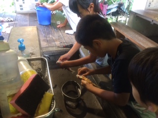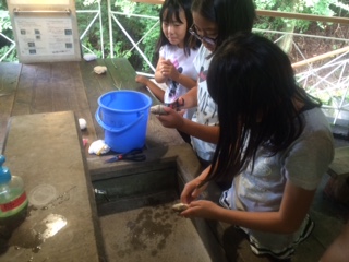 魚つかみの後,魚をさばいているところです。魚の命をいただくことを感じながらの活動です。