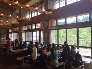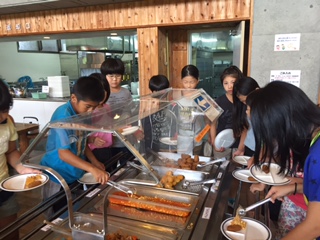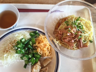 山の家での最後の食事です。今日の昼食も主食は選択制でした。「鶏てり丼」か「冷麺(みそ味)+白ごはん」です。