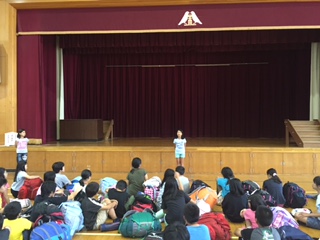 学校へ帰ってきました。体育館で解散式をしました。最後は体育館での式になりましたが,心配された台風の影響もなく,無事にすべての活動を行って帰ってきました。