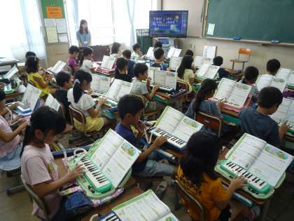 3年生が「ゆかいな木きん」をけんばんハーモニカで練習しています。それぞれのパートのリズムのちがいを感じとりながら,拍の流れにのって演奏しました。