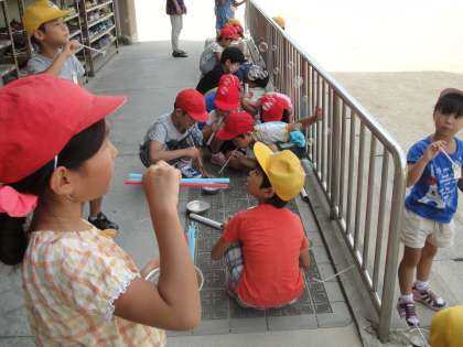 ストローを束ねたりラップの芯を使ったりして,いろいろな大きさのシャボン玉を作って楽しみました。優しく吹くと出やすいということに気付く子もいました。