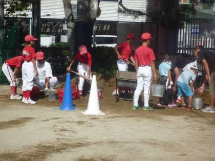 暑い中での作業でしたが,今年で3年目ですので,手際よく作業が進みます。山積みになっている土をバケツに入れる人,それを運んでまく人,ブラシでならす人。大きな山がすこしずつ小さくなっていきます。たくさんの子ども達も手伝っています。