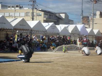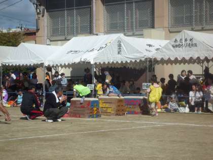 晴天の下,10日朱八区民体育祭が行われました。午前の1番は「少年障害物競走」です。小学生の競技でしたので,多くの朱八校の子ども達が出場していました。