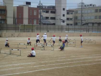 4年生のハードル走です。リズムよくハードルとハードルの間を3歩でいけるように練習をしています。