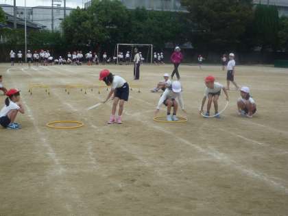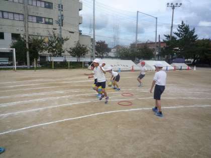 最後の練習です。子ども達は上手にフープをくぐって,ボールを運んでいます。