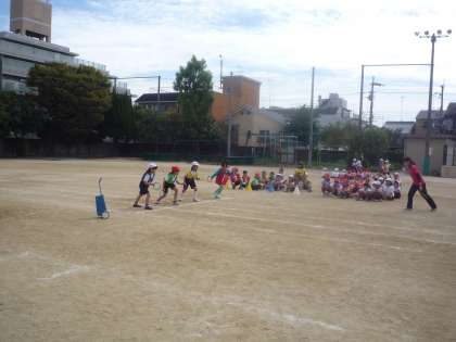 低学年の選択競技のリレーです。赤が勝ったり白が勝ったりしています。