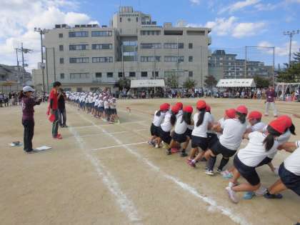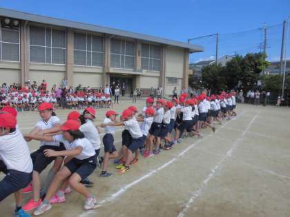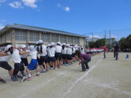 高学年の選択競技です。とても接戦でした。なかなか勝負がつきません。赤が勝ちそうになると,白が頑張ります。白が勝ちそうになると,今度は赤が・・
