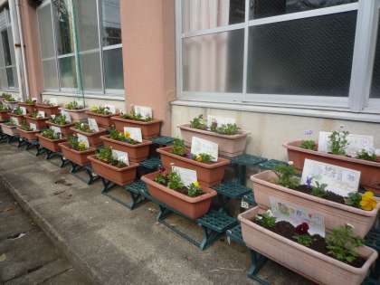 お花の植え替えが終わりました。学校の校門付近は桜の葉っぱが色づき始め,たてわりグループのお花も秋から冬の花に変わり,秋の深まりが感じられます。