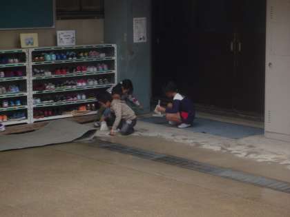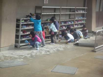 子ども達がくつ箱の掃除をしています。それぞれの手には小さなほうきと小さなちりとり。一人一人がもくもくと掃除をし,きれいにしてくれました。