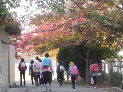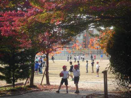 校門を入ると,体育倉庫の前あたりの木々もとてもきれいです。そして教室へ。宿題を提出したり,ランドセルに入れて持ってきた教科書やノートを机に入れると,運動場へ出てたくさんの子ども達が朝休みに遊んでいます。