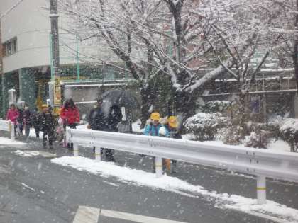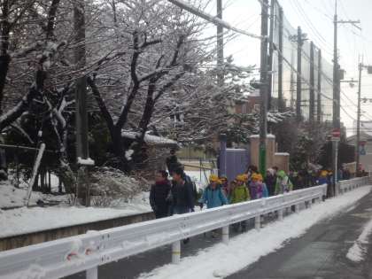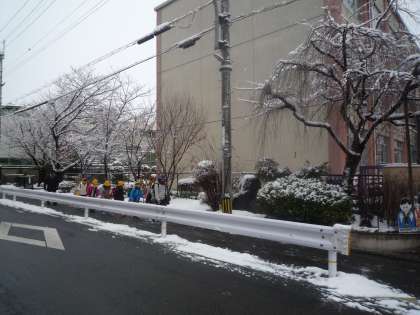 京都にこんなに雪が降るのは珍しいです。子ども達は元気に雪玉をもって登校してきます。