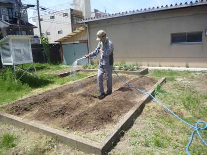 子ども達がずいきの芋苗を植えたら,最後に水をあげます。