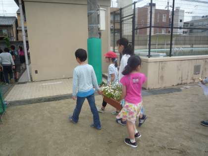 グループのお友達とプランターを運びお花を植える準備をします。