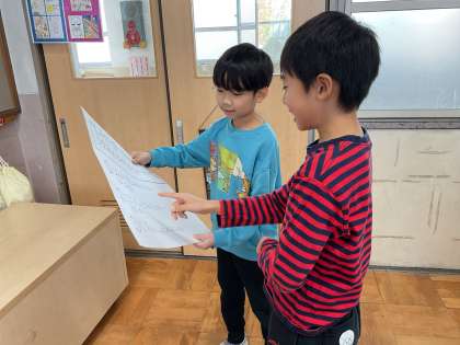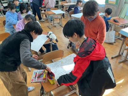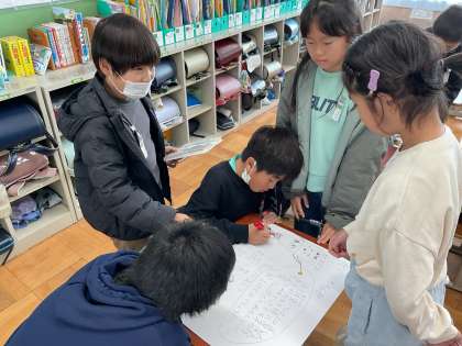 総合的な学習の時間では、「学ぼう 防災」で学習してきたことを他の学年の人にも伝えようと、グループで工夫しながら活動しています。