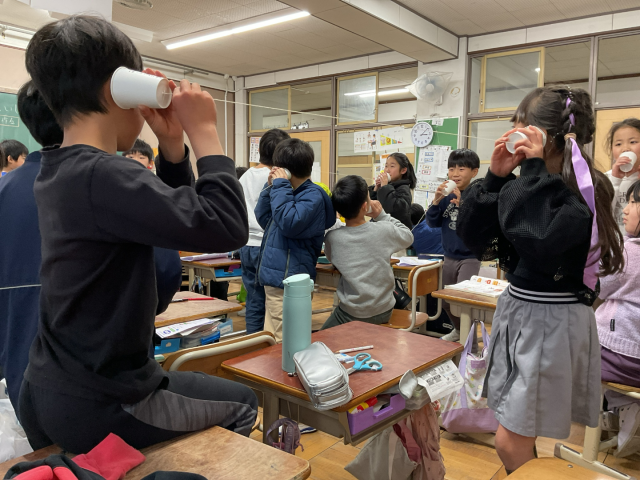 音が鳴るとき、音が聞こえるとき、どんな様子なのか調べるために、紙コップで糸電話を作り、実験しました。