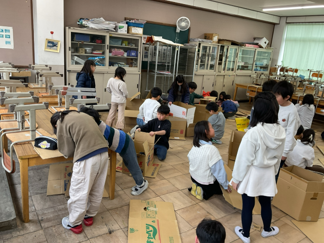 班で段ボールを切ったり、組み立てたりして、作品を作っています。