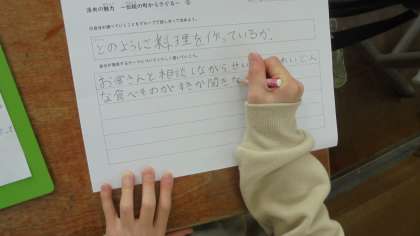 地域の方々にご協力いただき,洛央学区にある伝統について調べ,学びを深めていきます。自分たちの住む洛央のまちには,伝統文化を守り,また未来へとつなぐお仕事をされている方がたくさんいらっしゃいます。例年は,見学に行かせてもらい学びを深めていましたが,今年度は,インタビュー動画を撮影させてもらい,教室で視聴しました。これから,グループごとに,伝統を大事にされていることや,そのお店の歴史,お店の方の願いなどをまとめていく予定です。