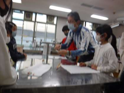 今日は,社長さんのご厚意で,田中直染料店を調べている子たちに「藍染め」を教えていただきました。染め方,絞り方などを教えていただいた後に実際に作りました。