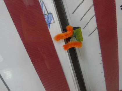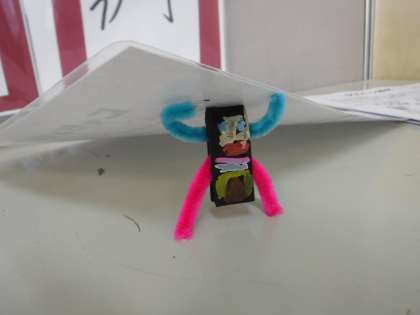 「すきまちゃん」というのは,粘着剤つきクッション材のすきまテープと,モール2本をつなぎ合わせた親指サイズの人形です。顔を描いて人形が完成すると,みんなはすきまちゃんと一緒に,教室やオープンスペースの隙間を見つけに行きました。