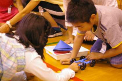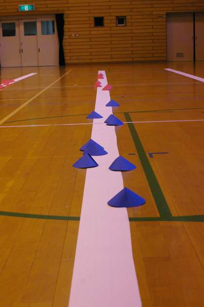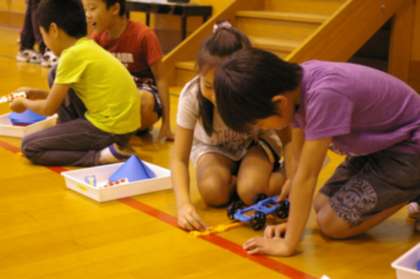 今日は,ゴムの伸ばし方で車が走る距離はどのように違うのかという実験を,広いスペースの体育館で行っていました。
