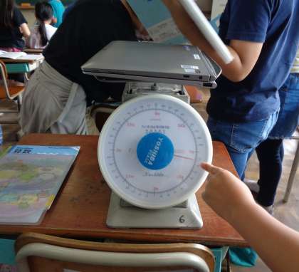 子どもたちは「タブレットが1kgくらいだったからくらべたらいいかも!」「この前はかったもので1kgだったものをもう一回もってみよう!」と工夫していました。