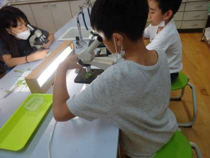 理科の学習で「植物の成長と水の関わり」について学習しています。顕微鏡を使ってホウセンカの茎の断面や葉の裏の気孔を見ました。植物のつくりに驚いている様子でした。