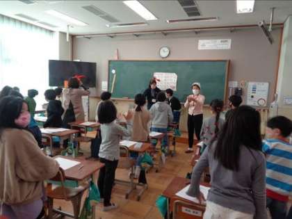 子どもたちは、「We wish you a merry christmas」のダンスを教えてもらって、一緒に踊りながら歌ったり、ビンゴをしたりしました。また、ビンゴになった子どもたちは、クリスマスの塗り絵をもらい、とても楽しい時間を過ごすことができました。