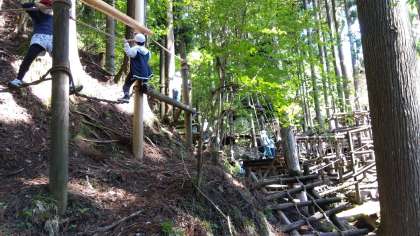 午後のもう1つの活動は冒険の森。フィールドアスレチックを楽しみました。ロープを上手に持ちながら、自分の体重を前へ前へと移していきます。