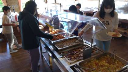 お風呂に入ってリフレッシュしたら、お待ちかねの夕食でした。山登りでお腹もすいていました。バイキングは好きなメニューはもちろんですが、苦手なおかずも入れるように意識している人が見られました。おいしくいただけました。なかにはご飯を三杯以上おかわりしている人もいました。食べることが活力になります。夜のキャンプファイヤーに向けてエネルギーを蓄えられました。