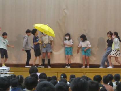 また、運営委員会から、「傘の正しい使い方」についての劇がありました。梅雨に入り、これから傘を使う機会が増えるので、みんなも改めて傘の使い方を考えることができました。