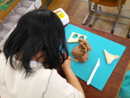 図画工作では、粘土を使った作品作りを楽しみました。木べらや割り箸、糸などの道具を使いながら、粘土をかきだしたり、切ったり、くっつけたりしました。道具を使うことでいろいろな模様ができました。作った作品を友だちと交流し楽しみました。