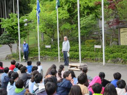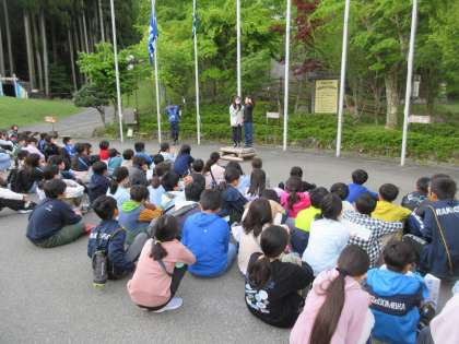 朝の集いとして岩倉北小学校の皆さんと一緒に学校紹介をしました。今日は登山活動を中心に頑張っていきます。