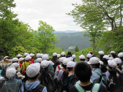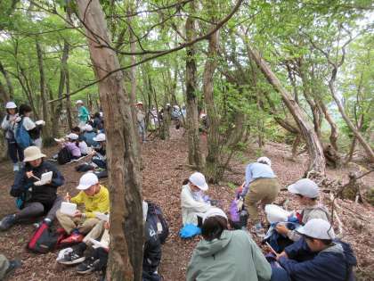 頂上までの途中にあるヤッホーポイントでは、山の家の宿舎めがけて大きな声で「ヤッホー」とさけびました。宿舎にいる方にも届き、向こうからも「ヤッホー」を叫んでもらい、見事に聞き取ることができました。
