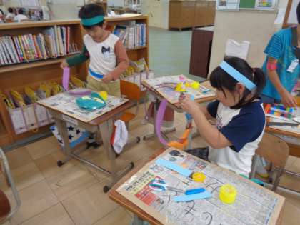 まずは、頭につけるわっかや、腰につけるわっかなどの土台を作りました。そこから発想し、「ねこになってみようかな?」「忍者になってみようかな?」といろいろなものになりきろうと、進めていました。