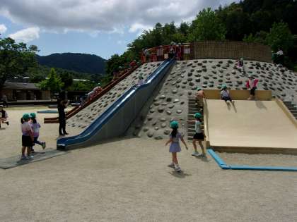 「子どもの楽園」には遊具がいっぱいです。大型滑り台ではみんな大盛り上がりです。