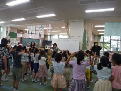 9月3日(火)1年生で初めての、英語活動の授業がありました。ラクラクキッズの方が来てくださり、英語であいさつをしたり、気持ちをたずねたり、答えたりしました。