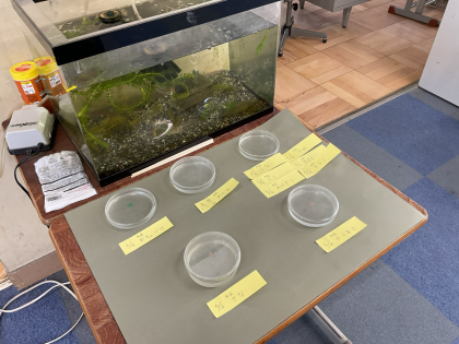 6年生のフロアにあるメダカの水槽。子どもたちが日々エサをあげたり、様子を観察したりしていると、先日卵を発見しました。5年生の理科でもメダカについて一度学習をしています。その経験から、観察がしやすいように、一つずつ卵をシャーレに入れて、名前もつけました。孵化に向けてお世話をしていきます。