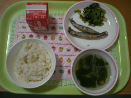 ☆ 今日の献立 ☆ ・麦ご飯 ・牛乳 ・ししゃものからあげ ・青菜の中華風炒め ・わかめスープ