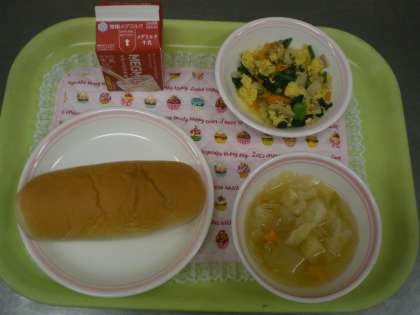 ☆ 今日の献立 ☆ ・味付けコッペパン ・牛乳 ・洋風いり卵 ・野菜スープ