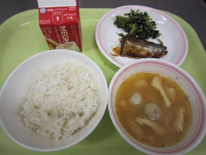 ☆ 今日の献立 ☆ ・麦ご飯 ・牛乳 ・さんまのかわり煮 ・だいこん葉のごま炒め ・いものこ汁