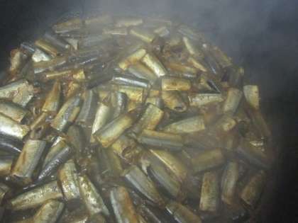 さんまのかわり煮は,ごま油でしょうがを炒めてから赤みそ・米酢・豆板醤・三温糖・しょうゆ・料理酒を煮たてた中にさんまをいれてコトコト煮ました。