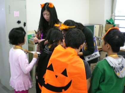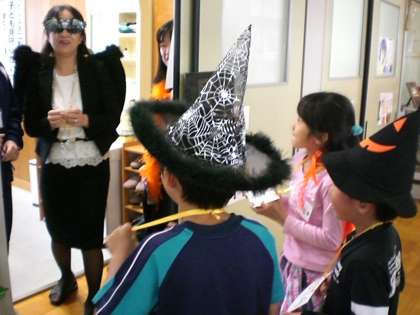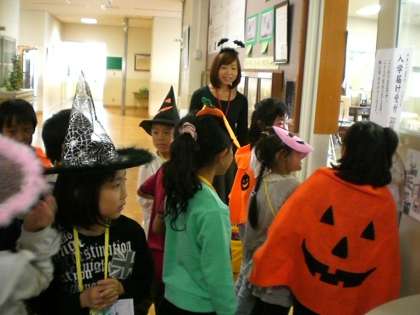 子ども達は3人グループに分かれて,いろいろな部屋を訪ね「Knock knock Knock Trick or treat Trick or treat 」と元気な声を出していました。