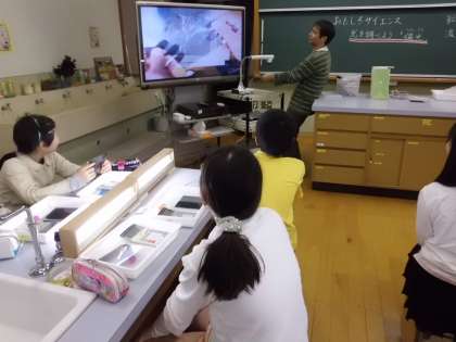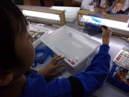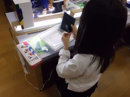 今回のおもしろサイエンスは偏光板を使って光の見え方の不思議を実験しました。偏光板を通して,プラスチックスプーンやビー玉,CDケースなどを見ると不思議な虹色に見えます。セロハンテープを何枚も重ねて貼って,赤や青や黄色に見える色が変化する現象を楽しみました。最後はおうちの人を驚かせようとわくわくしながらマジックウォールを作って持って帰りました。