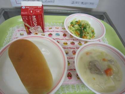 ☆ 今日の献立 ☆ ・ミルクコッペパン ・牛乳 ・じゃがいものクリームシチュー ・アスパラガスのソティ
