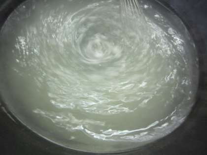 水と粉寒天をかき混ぜながら加熱して砂糖を加え、缶詰のみかんとパインアップルを入れて仕上げます。