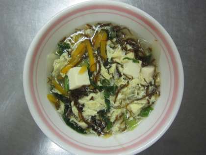沖縄県産のモズクを使用し、卵・とうふ・玉ねぎ・人参・チンゲン菜の具だくさんのスープです。