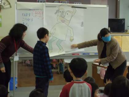 2年生の「RAKU RAKU KIDS PLUS」があり,日本の福笑いのようにして,身体の名称の英語を楽しみながら学びました。